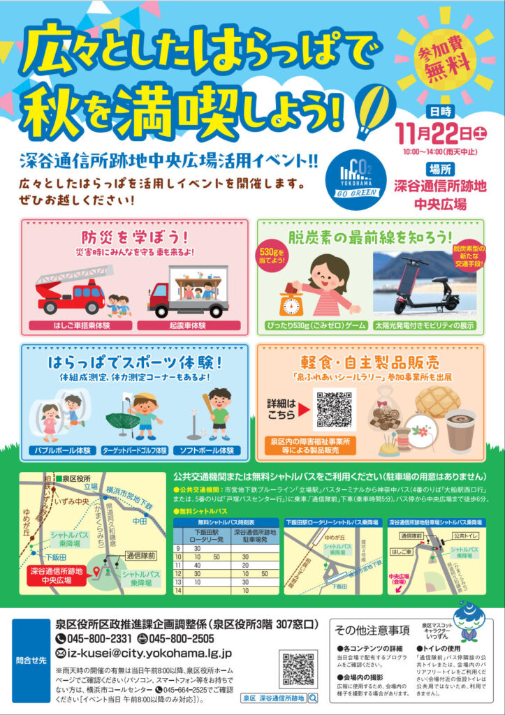 広大な「はらっぱ」を活用し、防災やスポーツ体験を通じて広場の利用促進と防災意識の向上を図る、横浜市泉区役所主催のイベントです。
